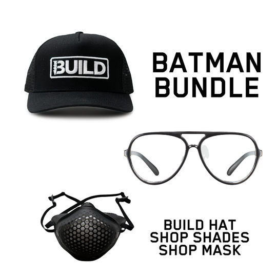 No reviewsThe BATMAN BUNDLE INCLUDES:BUILD TRUCKER HAT - $37SHOP SHADES STANDARD - $49.99BLACK SHOP MASK - 59.99SAVE - $36.98BUNDLE TOTAL = $110Sale price $110.00Regular price $146.98
