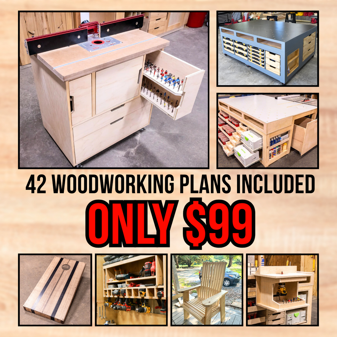 Are you a woodworker looking to grow your skills? Enhance your woodworking skills with our 42-plan bundle! Includes workbenches, miter stations, coffee tables, router tables, shop carts, and more. Get it all, valued at $345, for just $99!