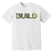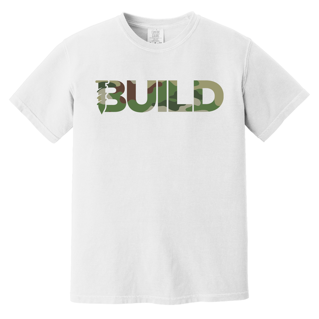 Camo on the outside. BUILD on the chest. Printed on our NEW Shop Shirt. This one is made for the shop, the jobsite, and beer runs.