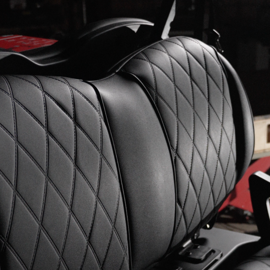 Up front you have upgraded matte black seats with a clean cross hatch pattern, and in the back there is a locking storage area to keep your tools and gear secure. Side mirrors with turn signals help you stay safe and visible.