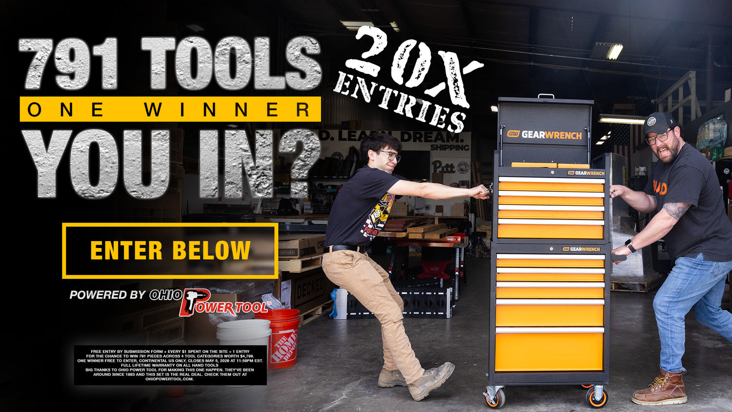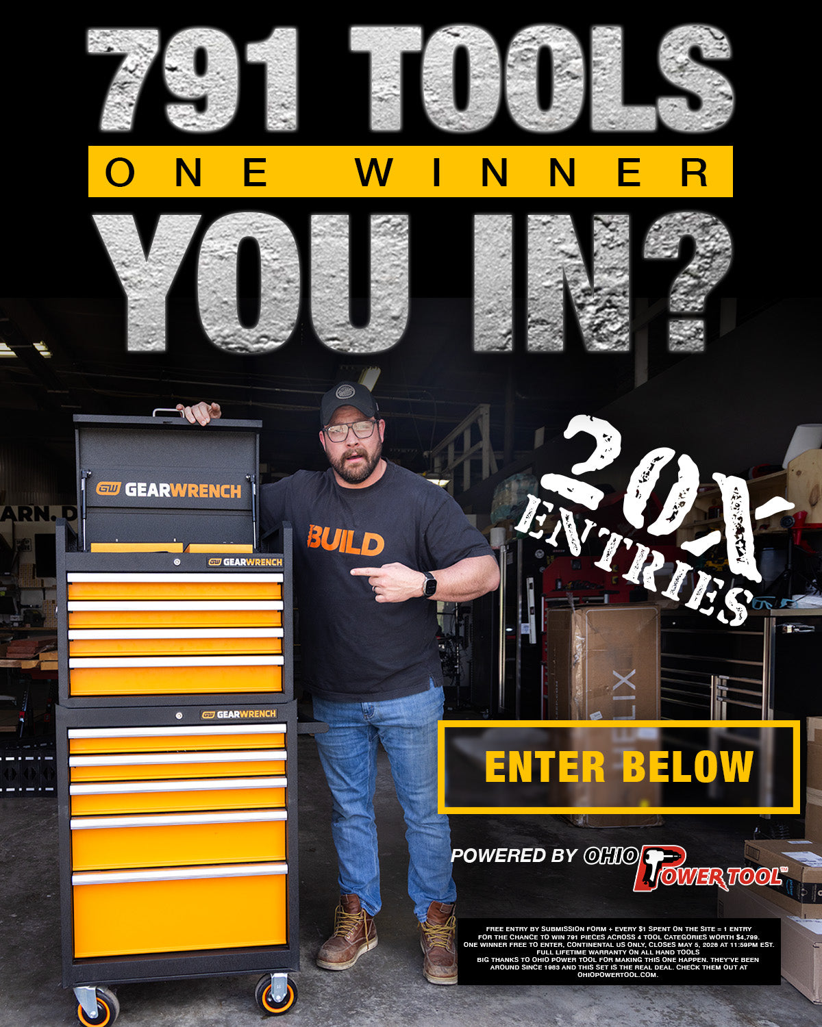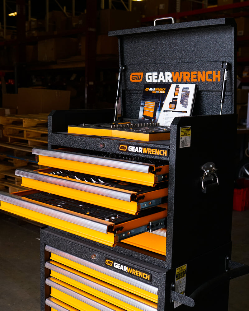 Win a $4,799 Gearwrench 791 Piece MEGAMOD tool set — a 26" rolling cabinet, 26" tool chest, and 791 pieces of professional mechanics tools organized in premium foam trays. Enter free with your email below, and every dollar you spend earns you extra entries.