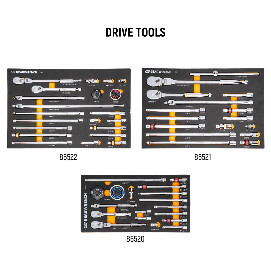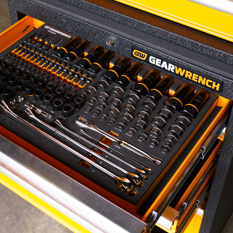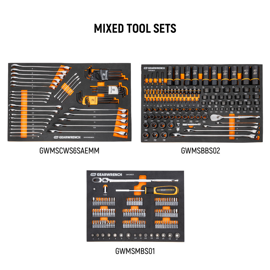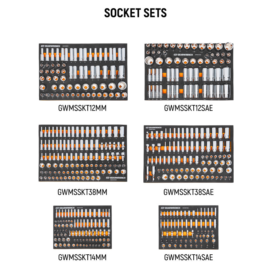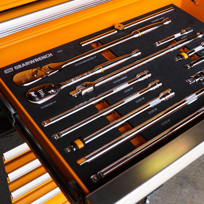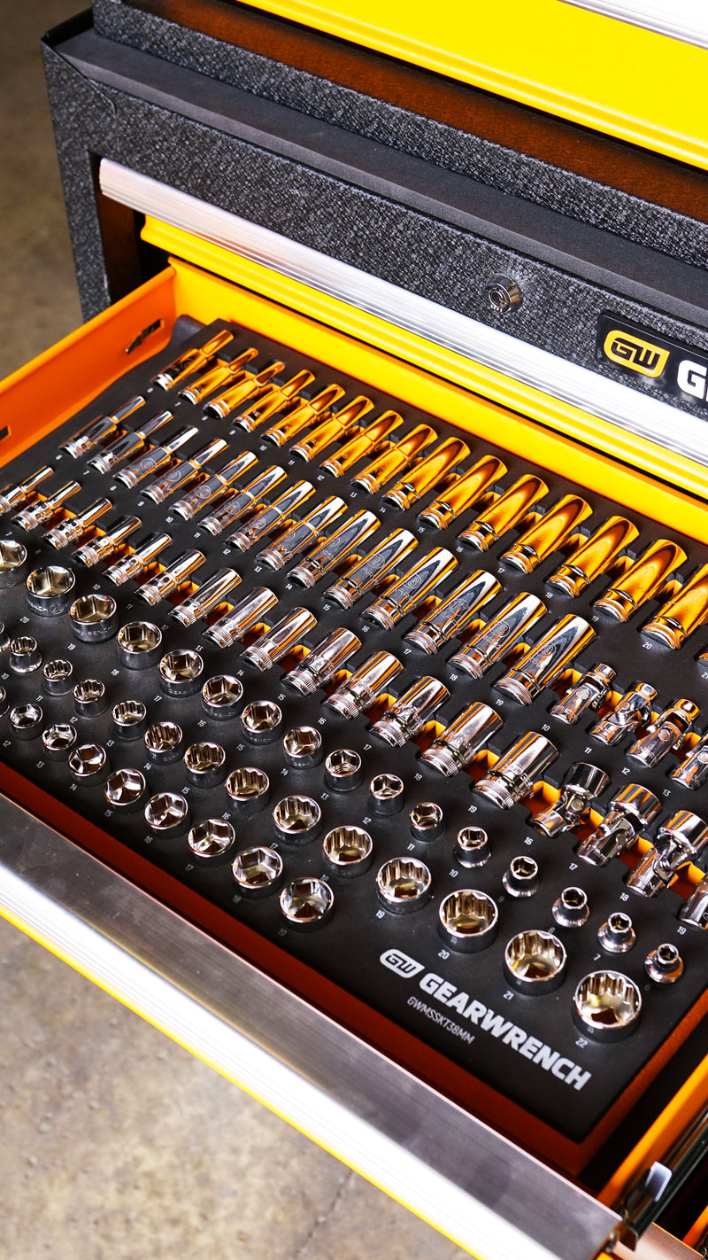 Everything ships pre-packed in premium foam storage trays with size markings so every tool has a home and you can actually find what you need when you need it.
