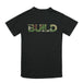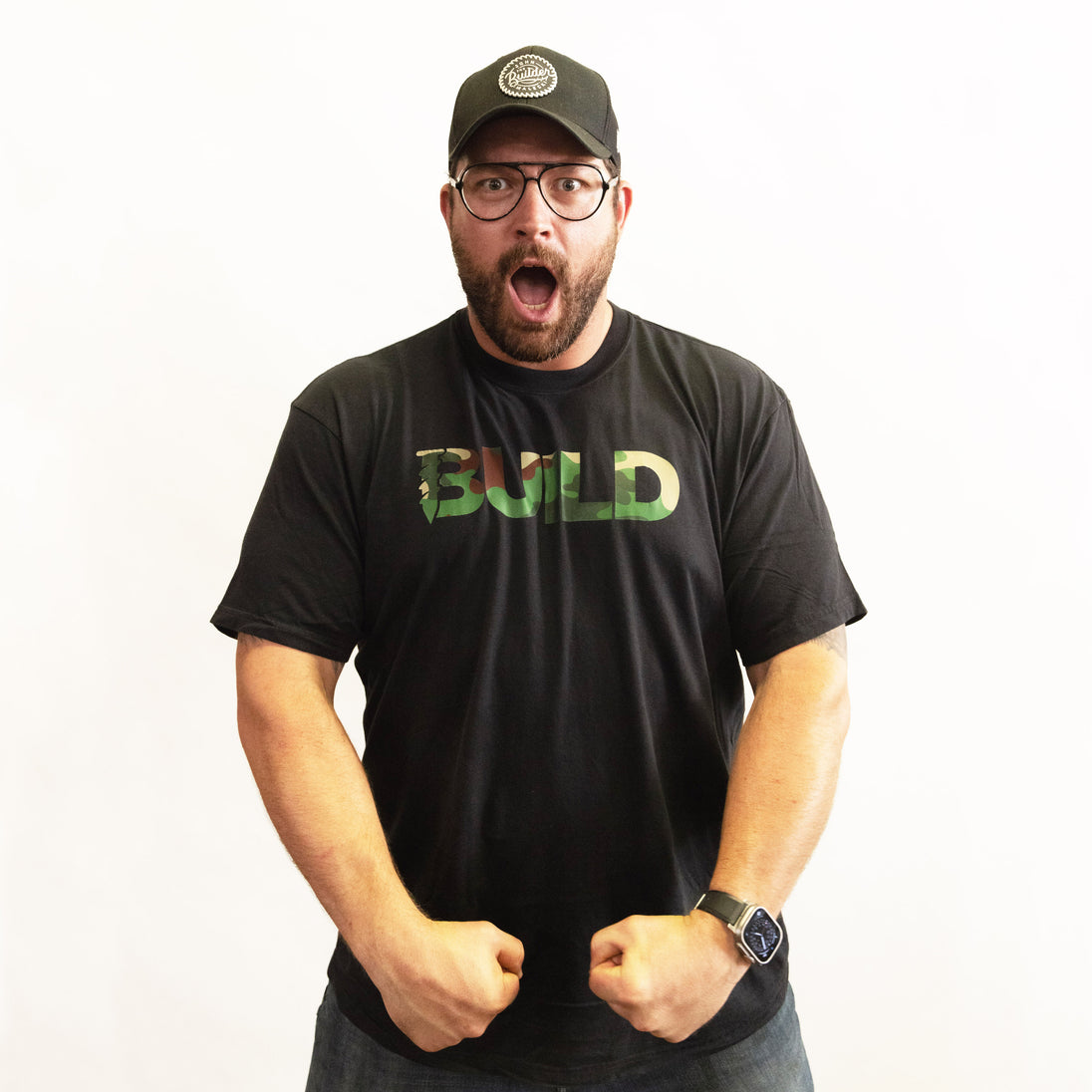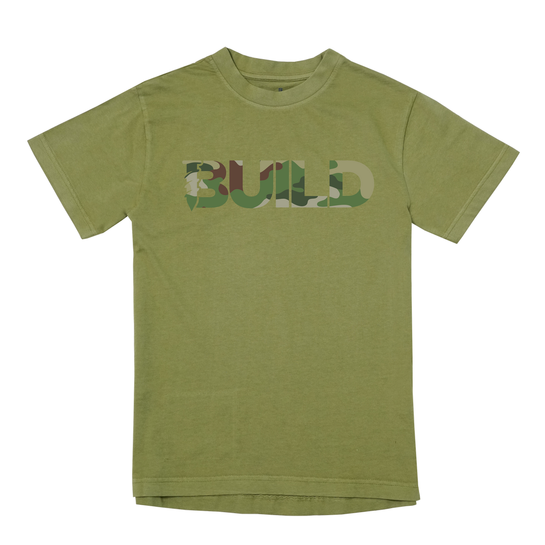Camo on the outside. BUILD on the chest. Printed on our NEW Shop Shirt. This one is made for the shop, the jobsite, and beer runs.